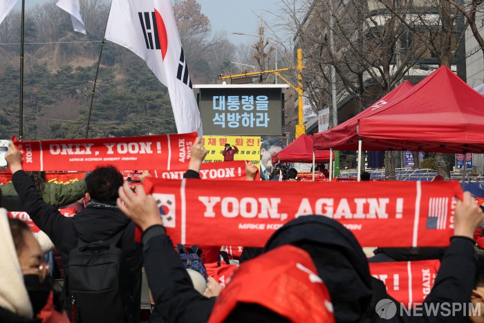 [서울=뉴스핌] 정일구 기자 = 윤석열 전 대통령의 특수공무집행방해 및 직권남용권리행사방해 등 혐의 사건 선고기일인 16일 오후 서울 서초구 서울중앙지방법원 인근에서 윤 전 대통령 지지자들이 석방을 촉구하고 있다. 2026.01.16 mironj19@newspim.com