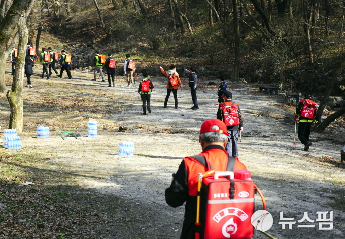 성남시 산불진화대가 분당구 불곡산 산불 현장에 등짐펌프를 메고 도보로 진입하고 있다.[사진=뉴스핌DB]