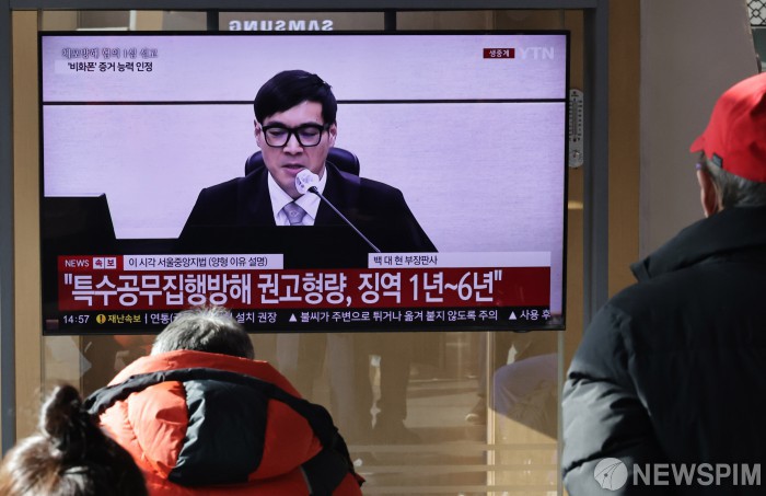 [서울=뉴스핌] 양윤모 기자 = 16일 오후 특수공무집행방해, 직권남용 권리행사방해 등 혐의로 기소된 윤석열 전 대통령에게 서울중앙지법 형사합의35부(백대현 부장판사)가 1심에서 징역 5년을 선고한 가운데, 서울역 대합실을 찾은 시민들이 관련 뉴스를 시청하고 있다. 2026.01.16 yym58@newspim.com