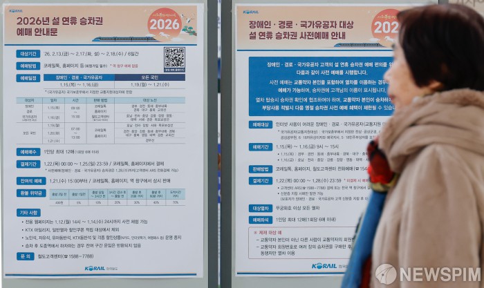 [서울=뉴스핌] 류기찬 기자 = 전국민 대상 설 연휴 열차 승차권 일반 예매가 시작된 19일 오전 서울역 대합실에 예매 안내문이 붙어있다. 설 연휴 승차권 일반 예매는 오늘부터 21일까지 사흘간 오전 7시부터 오후 1시까지 코레일톡과 공식 홈페이지를 통해 예매할 수 있다. 2026.01.19 ryuchan0925@newspim.com
