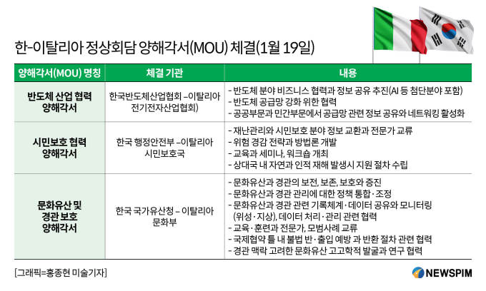 이 대통령은 "연간 100만 명에 이르는 한국 국민이 이탈리아를 찾을 정도로 한국 국민의 이탈리아에 대한 애정이 남다르다"며 "최근 이탈리아에서도 K-컬처의 인기가 높아져 한국을 찾는 이탈리아 국민들이 늘어나고 있다"고 평가했다.