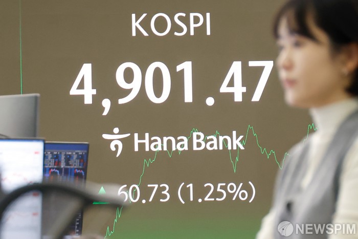 [서울=뉴스핌] 류기찬 기자 = 코스피가 장중 4900선을 돌파한 19일 오후 서울 중구 하나은행 딜링룸 전광판에 코스피 지수가 표시되고 있다. 2026.01.19 ryuchan0925@newspim.com