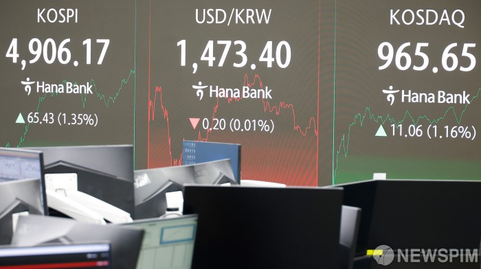 [서울=뉴스핌] 류기찬 기자 = 코스피가 장중 4900선을 돌파한 19일 오후 서울 중구 하나은행 딜링룸 전광판에 코스피, 달러/원, 코스닥 지수가 표시되고 있다. 2026.01.19 ryuchan0925@newspim.com