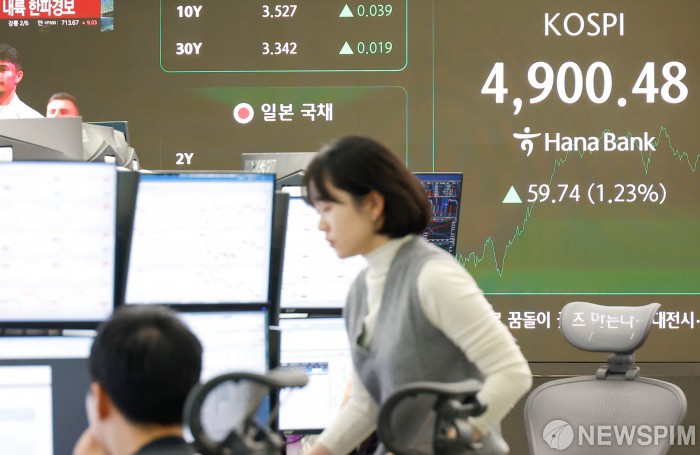 [서울=뉴스핌] 류기찬 기자 = 코스피가 장중 4900선을 돌파한 19일 오후 서울 중구 하나은행 딜링룸 전광판에 코스피 지수가 표시되고 있다. 2026.01.19 ryuchan0925@newspim.com