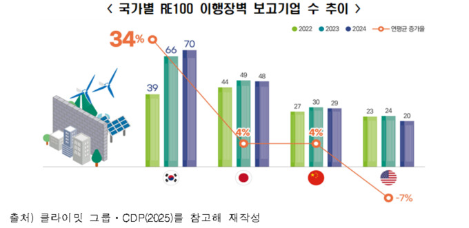 한경협은 이번 건의를 통해 기업의 원활한 재생에너지 조달을 위하여 수요 촉진과 공급 확대 등 2개 분야 20개 정책과제를 제시했다. 클라이밋 그룹과 탄소공개정보프로젝트(CDP) 위원회가 발간한 보고서에 따르면, 지난해 한국에서 재생에너지 조달에 어려움을 겪은 기업은 70개사로 2022년(39개사) 대비 80% 급증했다. 이는 미국(20개사)의 3.5배 수준으로, 이행 장벽이 보합 또는 감소세인 주요국과 달리 한국 기업의 부담은 갈수록 커지는 상황이다.