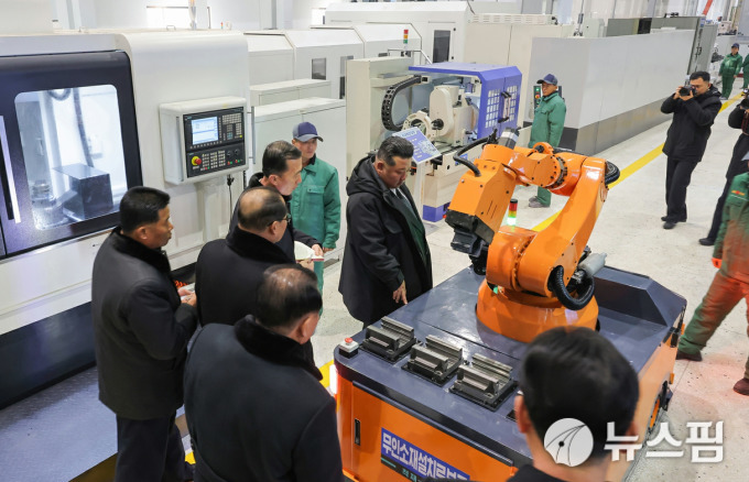 [서울=뉴스핌] 이영종 통일전문기자 = 김정은 북한 국무위원장이 19일 함남 함흥시에 있는 용성기계연합기업소를 방문해 생산라인에 설치된 로봇을 살펴보고 있다. [사진=노동신문] 2026.01.20 yjlee@newspim.com
