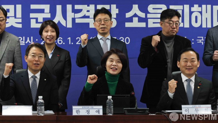 [서울=뉴스핌] 윤창빈 기자 = 한정애 더불어민주당 정책위의장, 이두희 국방부 차관 등 참석자들이 20일 서울 여의도 국회 의원회관에서 열린 군용비행장 및 군사격장 소음피해대책 관련 당정협의에서 기념촬영을 하고 있다. 2026.01.20 pangbin@newspim.com
