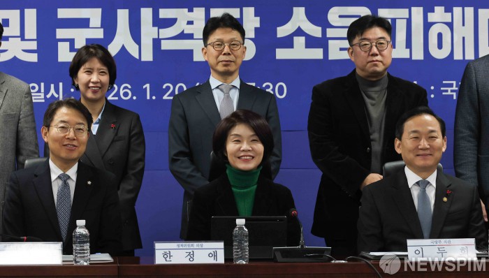 [서울=뉴스핌] 윤창빈 기자 = 한정애 더불어민주당 정책위의장, 이두희 국방부 차관 등 참석자들이 20일 서울 여의도 국회 의원회관에서 열린 군용비행장 및 군사격장 소음피해대책 관련 당정협의에서 기념촬영을 하고 있다. 2026.01.20 pangbin@newspim.com