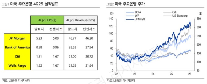 LS증권 전배승 애널리스트는 20일 발간한 리포트에서 "웰스파고를 제외한 미국 주요 은행의 2025년 4분기 실적이 시장 예상치를 상회했다"며 "합산 순이익은 285억달러로 전년 동기와 유사한 수준을 기록했다"고 밝혔다.