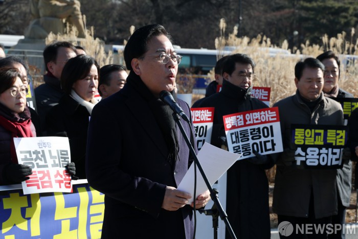 [서울=뉴스핌] 정일구 기자 = 송언석 국민의힘 원내대표가 20일 오전 서울 종로구 청와대 분수대 앞에서 열린 통일교 게이트·더불어민주당 공천뇌물 특검 촉구 규탄대회에서 규탄 발언을 하고 있다. 2026.01.20 mironj19@newspim.com