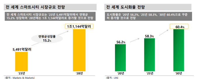 글로벌 시장조사기관 '마켓앤마켓'에 따르면 전 세계 스마트시티 시장은 2023년 5491억달러에서 연평균 15.2% 성장해 2028년에는 1조1144억달러 규모로 확대될 전망이다. 도시화 가속과 함께 교통, 에너지, 주거, 데이터 기반 도시 운영 수요가 급증하면서 대규모 인프라 투자가 이어질 것으로 분석된다.