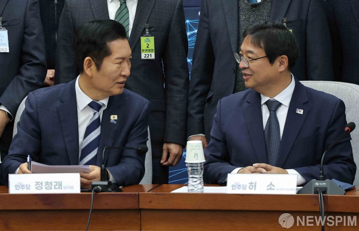 [서울=뉴스핌] 윤창빈 기자 = 정청래 더불어민주당 대표, 허소 더불어민주당 대구광역시당위원장이 20일 서울 여의도 국회에서 열린 AX 발전을 위한 정책간담회에서 대화하고 있다. 2026.01.20 pangbin@newspim.com