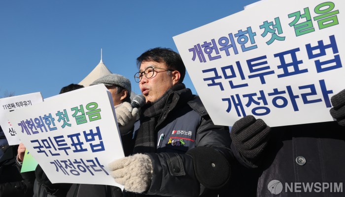 [서울=뉴스핌] 이형석 기자 = 시민주도 헌법개정 전국 네트워크가 21일 오전 서울 여의도 국회 앞에서 ‘11년째 직무유기, 국민투표법 개정 않는 국회 규탄한다!’ 신년기자회견을 열고 있다. 2026.01.21 leehs@newspim.com