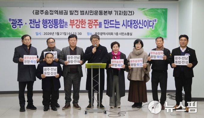 광주송정역세권 발전 범시민운동본부는 21일 광주시의회 시민소통실에서 기자회견을 열고 "광주·전남 행정동합을 통해 일자리와 먹거리를 창출할 수 있다"며 "부강한 광주를 만들어가는 데 반드시 필요하다"고 강조했다.