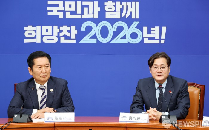 [서울=뉴스핌] 정일구 기자 = 홍익표 신임 청와대 정무수석이 21일 오후 서울 여의도 국회에서 정청래 더불어민주당 대표를 예방하며 발언하고 있다. 2026.01.21 mironj19@newspim.com