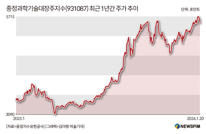 중국 A주 대표지수 산출기관 중정지수유한공사(中证指数有限公司)가 A주 시장의 전자∙컴퓨터∙통신∙바이오테크 등 과학기술 분야에서 규모가 크고, 시장점유율이 높으며, 성장 역량이 강한 동시에 높은 연구개발 투자를 이어가는 50개 기술주 종목의 주가를 반영해 산출한 '중정과학기술대장주지수(931087)'는 지난 한 해 동안 52% 상승했다. 1월 20일 최신 종가 기준으로 올해 들어서만 6% 가까이 올랐다.