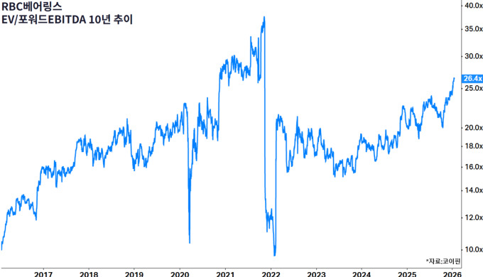 RBC를 둘러싼 여러 구조적인 순풍을 고려하면 회사의 밸류에이션은 추가 상향될 여지가 있다는 분석이 나온다. 현재 RBC의 향후 12개월분 EBITDA 추정치 컨센서스 대비 기업가치(=EV/EBITDA)는 26.4배다. 과거 10년 평균 추정치 약 23배 대비 15%대의 프리미엄 구간에 있는 셈이다. 바거 애널리스트는 항공우주·방산 사업의 생산율이 향후 수년 동안 의미 있게 가속화돼 견조한 이익 향상으로 이어질 것"이라고 했다.