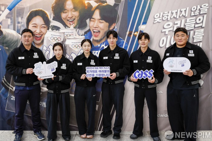[서울=뉴스핌] 지난 20일 2026 밀라노·코르티나담페초 동계올림픽 공식 파트너 카스가 동계올림픽을 앞두고 대한민국 국가대표 선수단·코치진의 선전을 기원하며 충북 진천 국가대표 선수촌에서 ‘카스 0.0 응원 부스’를 운영했다. 국가대표 선수들이 현장에 마련된 포토존 앞에서 기념촬영을 하고 있다. (왼쪽부터 대한민국 양궁 남자 국가대표 김우진 선수, 대한민국 쇼트트랙 여자 국가대표 김길리·최민정 선수, 대한민국 쇼트트랙 남자 국가대표 황대헌 선수, 대한민국 근대 5종 남자 국가대표 전웅태 선수, 대한민국 유도 남자 국가대표 김민종 선수) 2026.01.21 photo@newspim.com