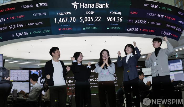 [서울=뉴스핌] 양윤모 기자 = 22일 오전 코스피가 5000 을 돌파하자 서울 중구 하나은행본점 딜링룸에서 직원들이 환호하고 있다. 한편 이재명 대통령은 더불어민주당 '코스피 5,000 특별위원회' 소속 위원들을 청와대로 초청해 오찬을 함께한다. 2026.01.22 yym58@newspim.com