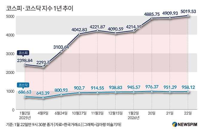 [서울=뉴스핌] 이나영 기자= 코스피가 22일 장중 5000선을 돌파하며 이른바 '오천피' 시대를 열었다. 대형주 중심의 강세가 이어지며 지수 상단이 빠르게 열렸지만, 코스닥은 1000선 부근에서 완만한 상승 흐름을 보이고 있다. 코스피와 비교하면 체감 강도에는 분명한 온도 차가 있다는 평가가 나온다.