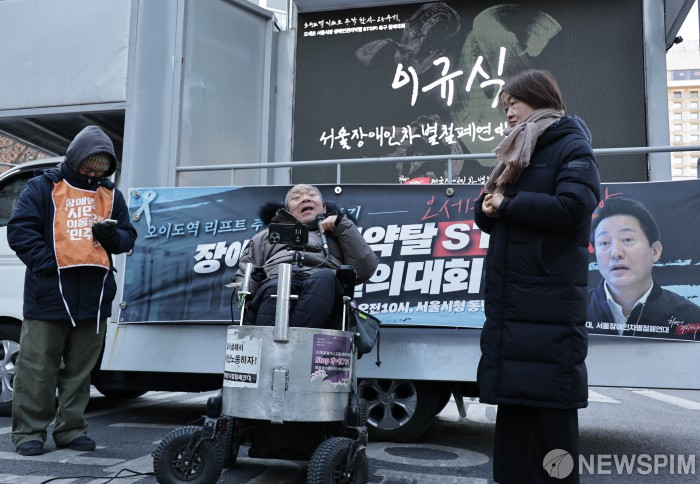 [서울=뉴스핌] 양윤모 기자 = 오이도역 리프트 추락참사 25주기를 맞아 전국장애인차별철폐연대와 민주노총이 22일 오전 '오세훈 서울시장 장애인권리약탈 STOP! 촉구 결의대회'를 서울시청 동편에서 개최 했다. 참석자들은 ‘약자와의 동행’이라는 구호 아래 감춰진 서울시의 기만적 행정을 폭로하며 오세훈 서울시장에 의해 하루 아침에 강행된 권리중심 최중증 장애인 맞춤형 공공일자리 폐지를 규탄했다. 2026.01.22 yym58@newspim.com