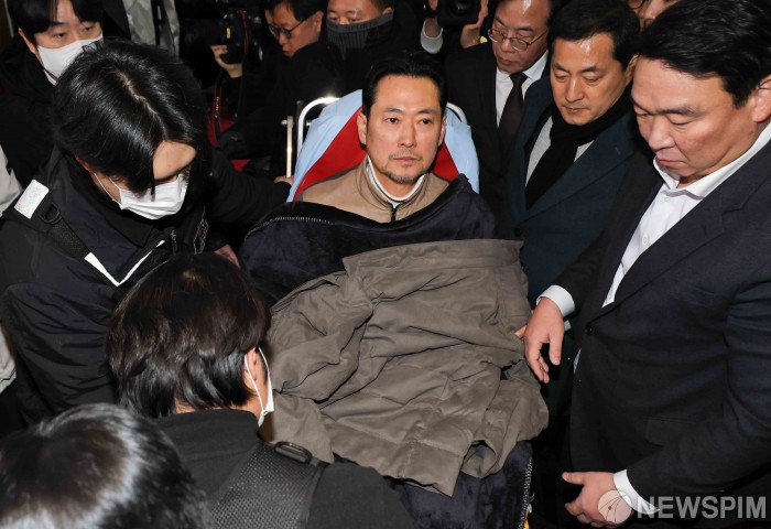 [서울=뉴스핌] 윤창빈 기자 = 통일교·공천헌금 '쌍특검'을 요구하며 8일째 단식을 진행 중인 장동혁 국민의힘 대표가 22일 서울 여의도 국회에서 단식을 중단하고 병원으로 이송되고 있다. 2026.01.22 pangbin@newspim.com