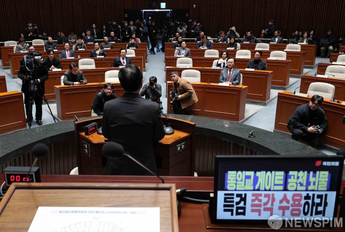 [서울=뉴스핌] 윤창빈 기자 = 송언석 국민의힘 원내대표가 22일 서울 여의도 국회에서 열린 긴급 의원총회에서 모두발언을 하고 있다. 2026.01.22 pangbin@newspim.com