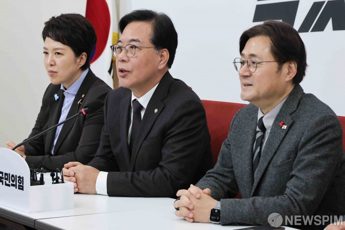 [서울=뉴스핌] 윤창빈 기자 = 송언석 국민의힘 원내대표가 22일 서울 여의도 국회에서 홍익표 청와대 정무수석을 접견한 가운데 발언하고 있다. 2026.01.22 pangbin@newspim.com