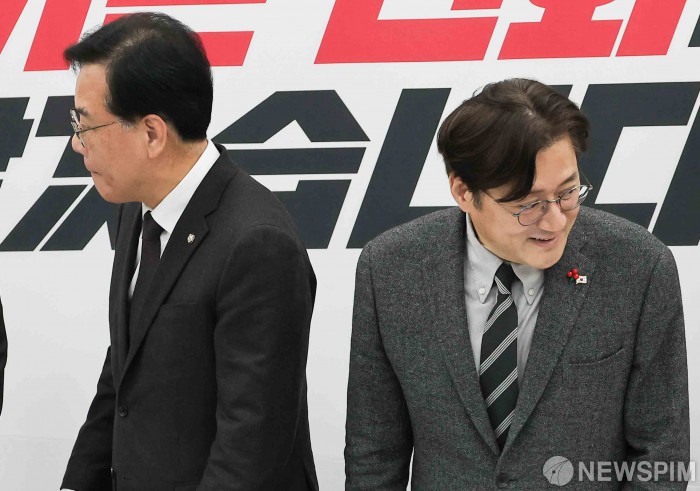 [서울=뉴스핌] 윤창빈 기자 = 홍익표 청와대 정무수석이 22일 서울 여의도 국회에서 송언석 국민의힘 원내대표를 예방해 기념촬영을 마치고 돌아서고 있다. 2026.01.22 pangbin@newspim.com