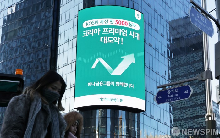 [서울=뉴스핌] 양윤모 기자 = 22일 코스피가 장중 사상 첫 5000선을 돌파하자 서울 중구 하나은행본점의 전광판에 '코리아 프리미엄 시대 대도약!'을 알리는 하나금융그룹의 축하 문구가 송출되고 있다. 한편 이재명 대통령은 더불어민주당 '코스피 5,000 특별위원회' 소속 위원들을 청와대로 초청해 오찬을 함께했다. 2026.01.22 yym58@newspim.com