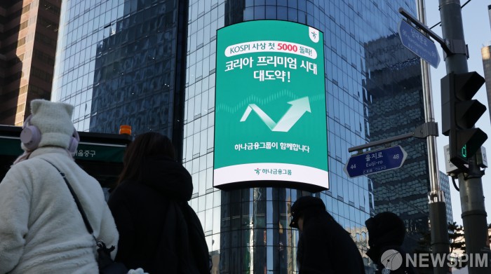 [서울=뉴스핌] 양윤모 기자 = 22일 코스피가 장중 사상 첫 5000선을 돌파하자 서울 중구 하나은행본점의 전광판에 '코리아 프리미엄 시대 대도약!'을 알리는 하나금융그룹의 축하 문구가 송출되고 있다. 한편 이재명 대통령은 더불어민주당 '코스피 5,000 특별위원회' 소속 위원들을 청와대로 초청해 오찬을 함께했다. 2026.01.22 yym58@newspim.com
