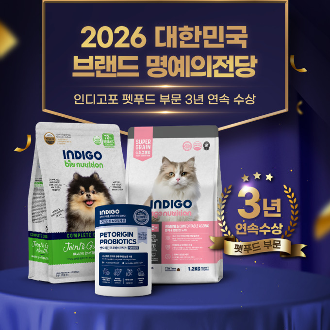 [서울=뉴스핌] 이나영 기자= 프리미엄 펫푸드 전문기업 오에스피의 브랜드 '인디고포'가 '2026 대한민국 브랜드 명예의 전당' 펫푸드 부문에서 3년 연속 수상하며 국내 펫푸드 시장에서의 브랜드 경쟁력을 다시 한번 입증했다고 23일 밝혔다.