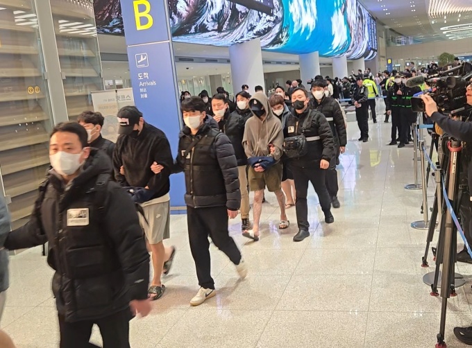 [인천=뉴스핌] 박성준 기자 = 23일 오전 인천국제공항. 캄보디아에서 우리 국민을 상대로 범죄를 저지른 한국 국적 피의자 73명이 천으로 가려진 수갑을 찬 채 고개를 숙이고 한 줄로 모습을 드러냈다. 경찰관들은 송환자 1명당 2명씩 배치돼 양팔을 붙잡고 이들을 호송차량이 대기 중인 주차장 방향으로 연행했다. 범죄 피의자 국내 송환 가운데 역대 최대 규모다.