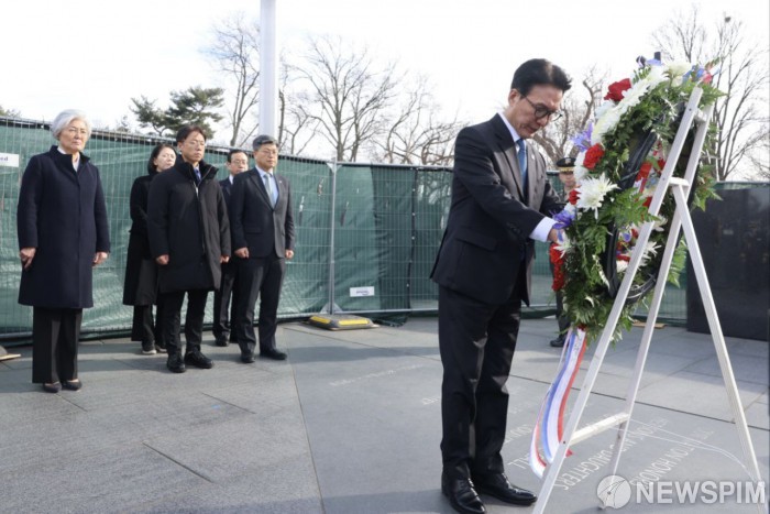 [서울=뉴스핌] =김민석 국무총리가 22일(현지시간) 미국 워싱턴D.C. 한국전 참전기념공원을 찾아 한국전 참전기념비에 헌화하고 있다. [사진=총리실] 2026.01.23 photo@newspim.com