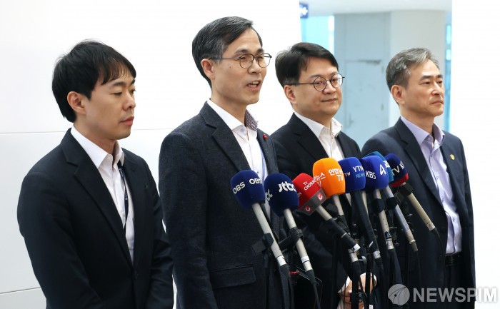 [영종도=뉴스핌] 정일구 기자 = '초국가범죄 특별대응 TF' 유승렬 치안감(왼쪽 두번째)이 23일 오전 인천국제공항 제2여객터미널 입국장에서 '로맨스 스캠 부부사기단' 등 캄보디아에서 각종 범행을 저지른 한국인 범죄 피의자 73명 송환 관련 브리핑을 하고 있다. 2026.01.23 mironj19@newspim.com