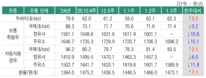 지난주(1월 2주) 정유사 휘발유 공급가격은 전주보다 10.8원 하락한 리터당 1601.1원, 경유 공급가격은 6.0원 하락한 리터당 1457.3원으로 집계됐다.