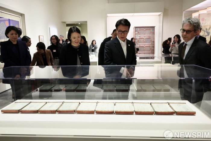 [서울=뉴스핌]김민 석 국무총리가 23일(현지 시간) 미국 워싱턴DC 스미소니언 미술관에서 열린 한국 미술 특별전을 관람하고 있다.[사진=총리실] 2026.01.24 photo@newspim.com