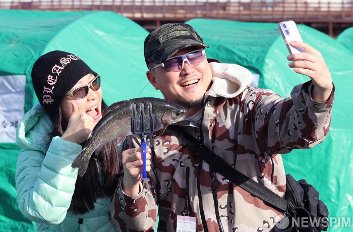 인증샷 즐기는 평창송어축제 찾은 방문객