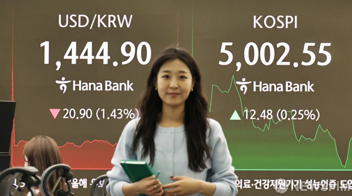 [서울=뉴스핌] 양윤모 기자 = 26일 오전 코스피가 전장 종가보다 12.48 포인트(0.25%) 상승하며 5002.55로, 코스닥은 38.58포인트(3.88%) 상승한 1032.51로 장을 시작한 가운데, 서울 중구 하나은행본점 딜링룸에서 직원들이 업무를 보고 있다. 서울외환시장에서 달러/원 환율은 전장 대비 20.90원 하락한 1444.90원에 주간거래를 시작했다. 2026.01.26 yym58@newspim.com