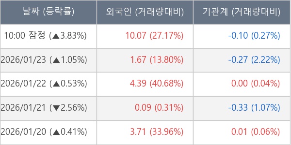 [서울=뉴스핌] 로보뉴스 = 26일 10시 15분 현재 이지홀딩스(035810)는 전일 대비 3.83% (현재가 5,010원) 상승했고, 외국인이 최근 7일 연속 순매수(누적 26.45만 주, 잠정) 행진을 하고 있다.