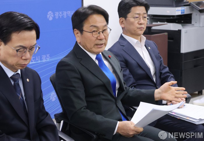 [광주=뉴스핌] 박진형 기자 = 강기정 광주시장이 26일 오전 기자실에서 행정통합 3차 간담회 논의 내용 관련해 언론 브리핑을 하고 있다. 2026.01.26 bless4ya@newspim.com