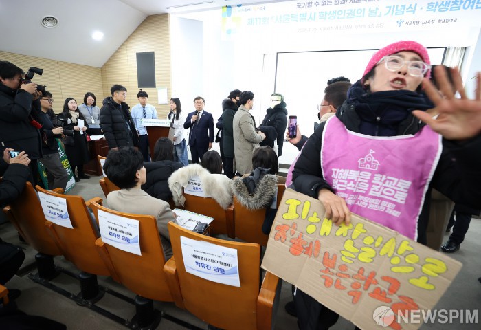 [서울=뉴스핌] 정일구 기자 = 복직 투쟁 중인 중학교 교사 지혜복 씨가 26일 오전 서울 중구 시청 서소문청사에서 열린 제11회 학생인권의 날 기념식에서 정근식 교육감에게 항의하고 있다. 2026.01.26 mironj19@newspim.com