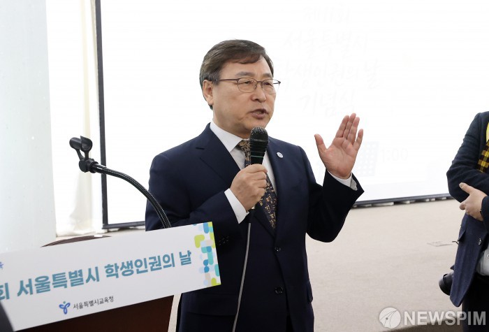 [서울=뉴스핌] 정일구 기자 = 정근식 서울시교육감이 26일 오전 서울 중구 시청 서소문청사에서 열린 제11회 학생인권의 날 기념식에서 복직 투쟁 중인 중학교 교사 지혜복 씨의 항의에 반박 발언을 하고 있다. 2026.01.26 mironj19@newspim.com