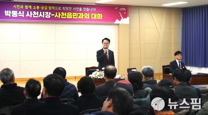 박동식 사천시장이 지난 23일 읍면동 순방차 사천읍 행정복지센터를 방문해 지역민들에게 인사말을 전하고 있다.[사천=뉴스핌]2026.01.26