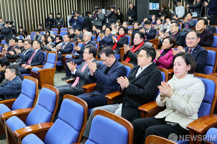 [서울=뉴스핌] 윤창빈 기자 = 25일 서울 여의도 국회에서 열린 국민의힘 의원총회에서 의원들이 장동혁 대표를 응원하는 박수를 치고 있다. 2026.01.26 pangbin@newspim.com
