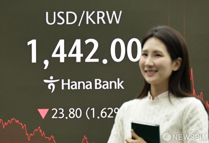 [서울=뉴스핌] 양윤모 기자 = 26일 오후 서울외환시장에서 달러/원 환율이 전장 대비 23.80원 하락한 1442.00원에 주간거래를 마감한 가운데, 서울 중구 하나은행본점 딜링룸에서 직원들이 업무를 보고 있다. 2026.01.26 yym58@newspim.com