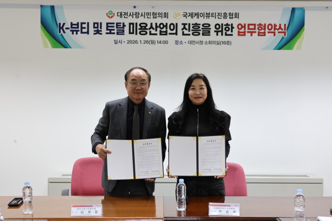 이날 협약식에는 대전사랑시민협의회 남재동 회장과 국제케이뷰티진흥협회 한승희 대표 등이 참석해 미용산업 증진과 K-뷰티 관광콘텐츠 발굴을 위한 업무협약에 나섰다.