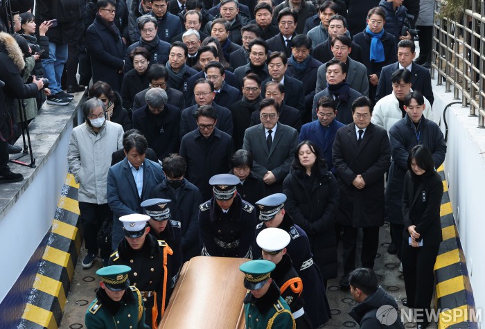 [서울=뉴스핌] 정일구 기자 = 우원식 국회의장과 김민석 국무총리를 비롯한 더불어민주당 의원들이 27일 오전 서울 종로구 서울대병원 장례식장에 도착한 고(故) 이해찬 전 국무총리의 운구 행렬을 뒤따르고 있다. 2026.01.27 mironj19@newspim.com