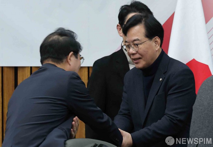 [서울=뉴스핌] 윤창빈 기자 = 송언석 국민의힘 원내대표가 27일 서울 여의도 국회에서 열린 '통일교 게이트·공천뇌물 특검법' 토론회에서 참석자와 인사를 나누고 있다. 2026.01.27 pangbin@newspim.com