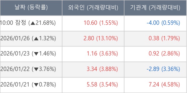 [서울=뉴스핌] 로보뉴스 = 27일 10시 15분 현재 한전산업(130660)은 전일 대비 21.68% (현재가 14,930원) 상승했고, 외국인이 최근 5일 연속 순매수(누적 23.49만 주, 잠정) 행진을 하고 있다.